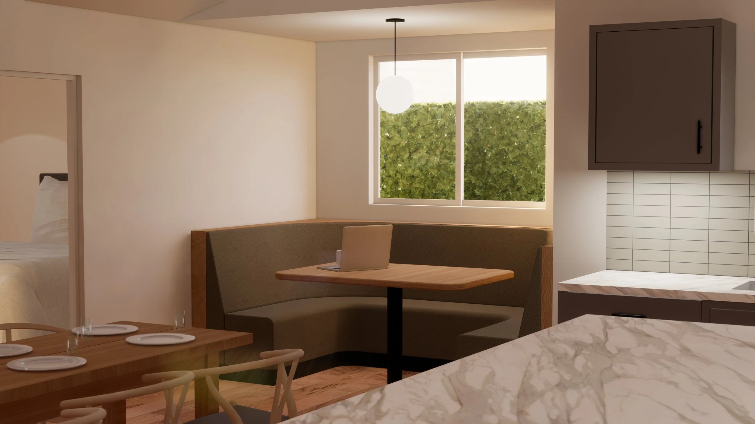 The transformation of a compact home in Monterey Park was led by Allied Projects, encompassing a complete interior and exterior remodel. The redesigned interior features an open-plan layout with vaulted ceilings and exposed wooden beams, creating a spacious and airy feel. The kitchen includes modern cabinetry, a large island with marble countertops, and a cozy built-in breakfast nook. The dining area is designed for both functionality and aesthetics, providing a warm and inviting space for meals. This comprehensive remodel enhances both the visual appeal and functionality of the home.