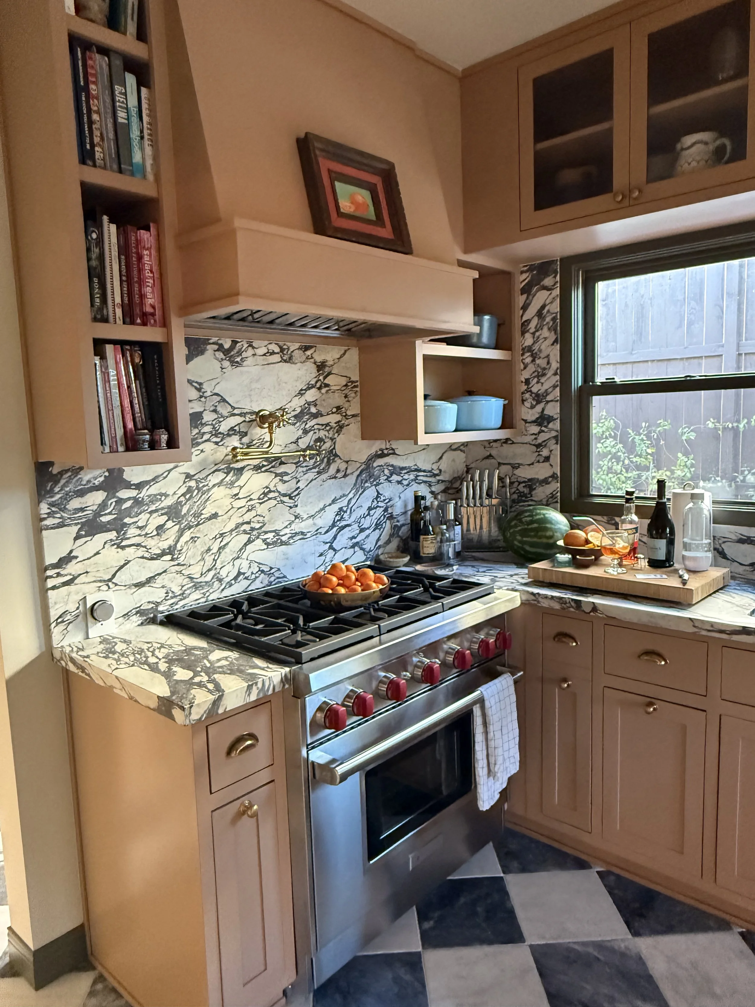 The interior kitchen remodel features custom cabinetry and high-end finishes, designed with a modern touch which complements the home's Spanish Revival style. The open and elegant design enhances functionality while maintaining a refined edge.